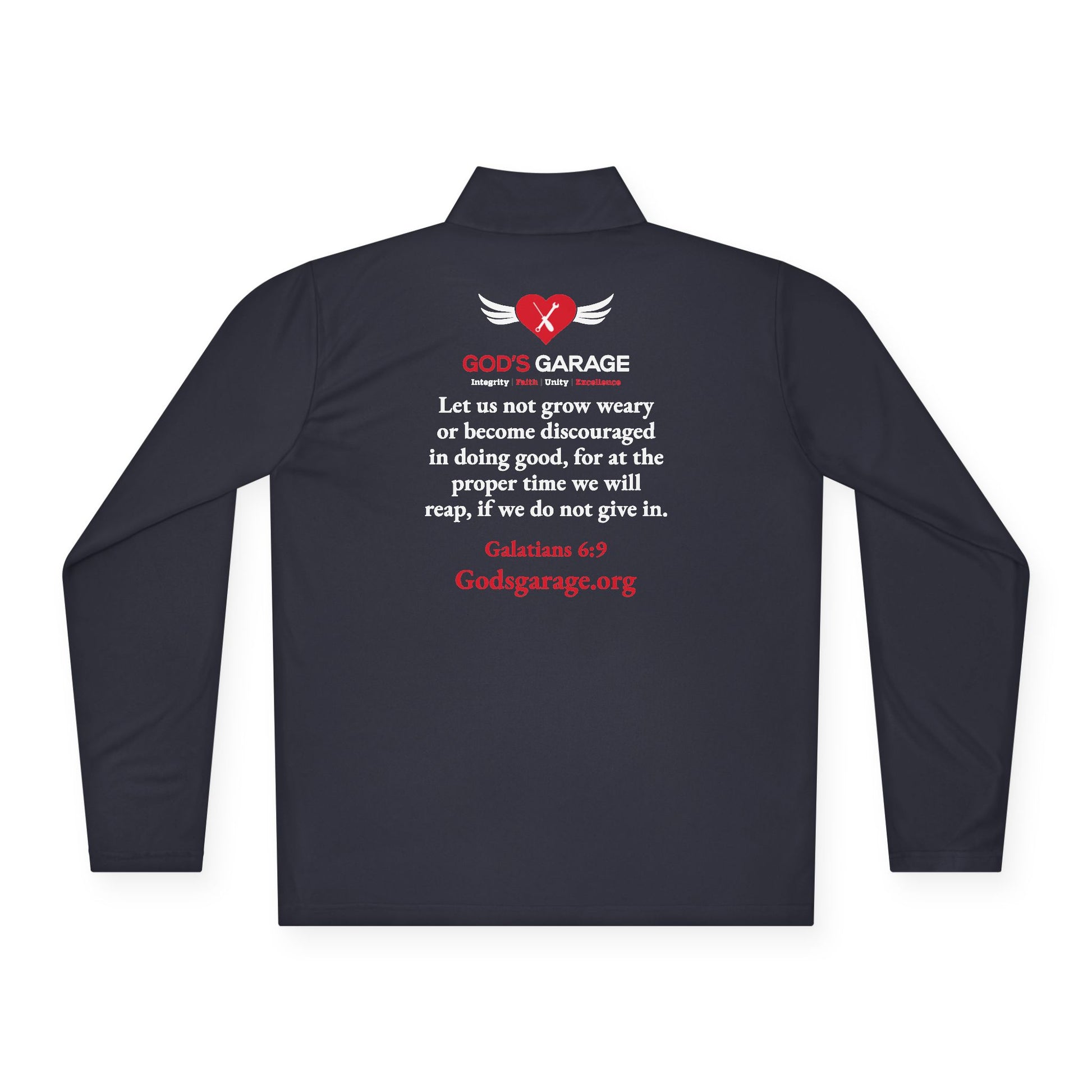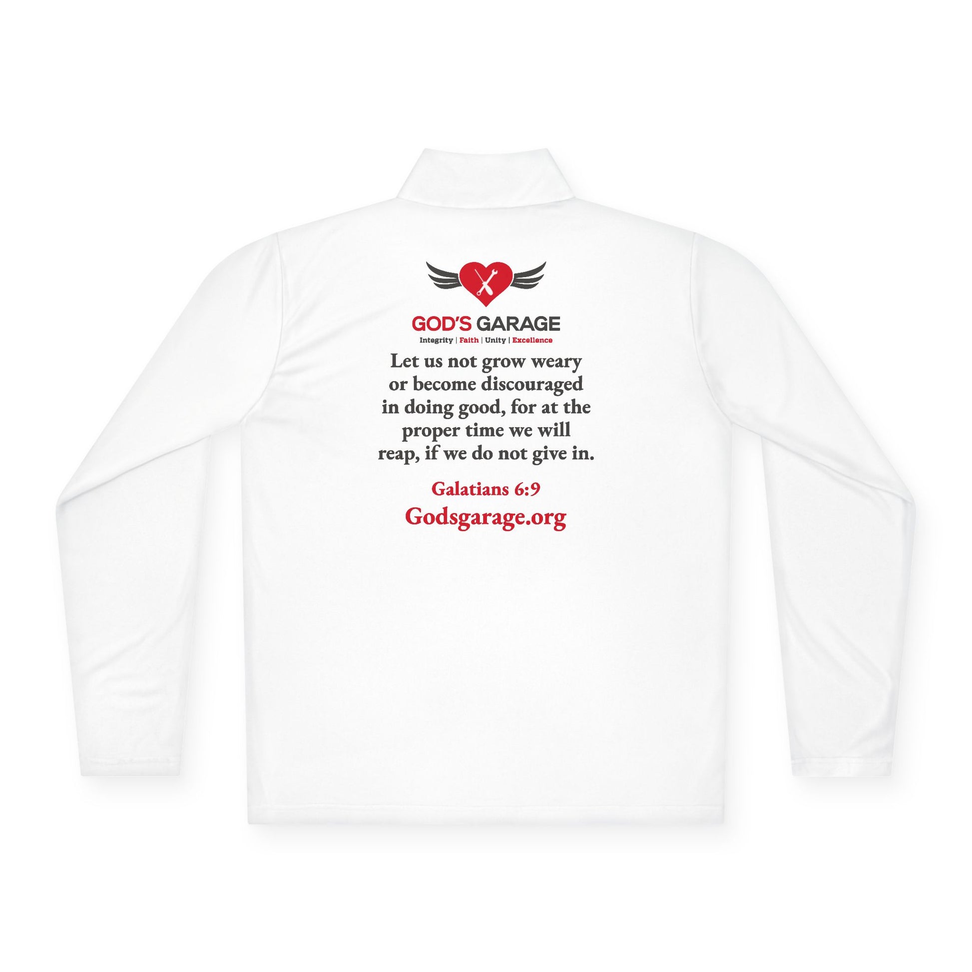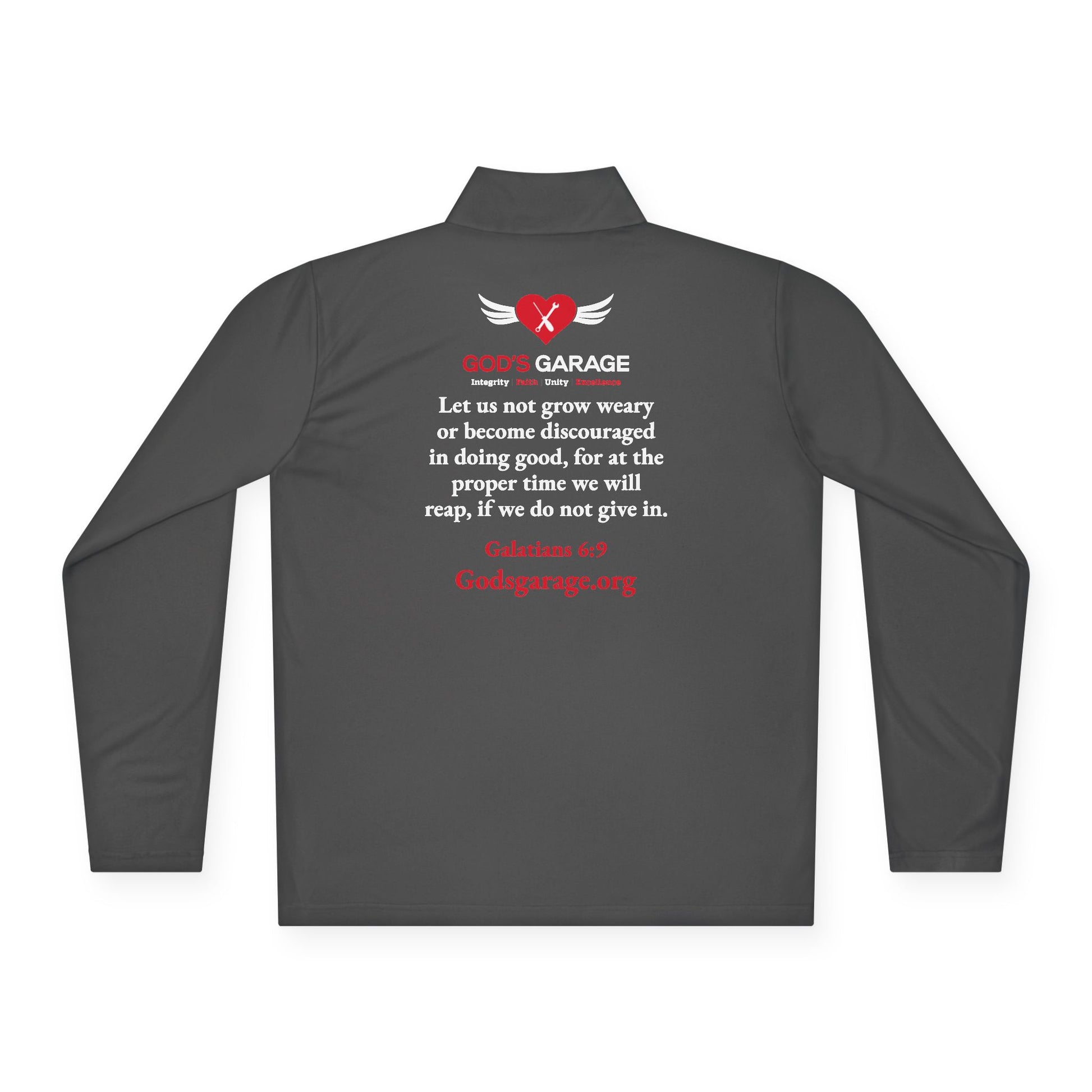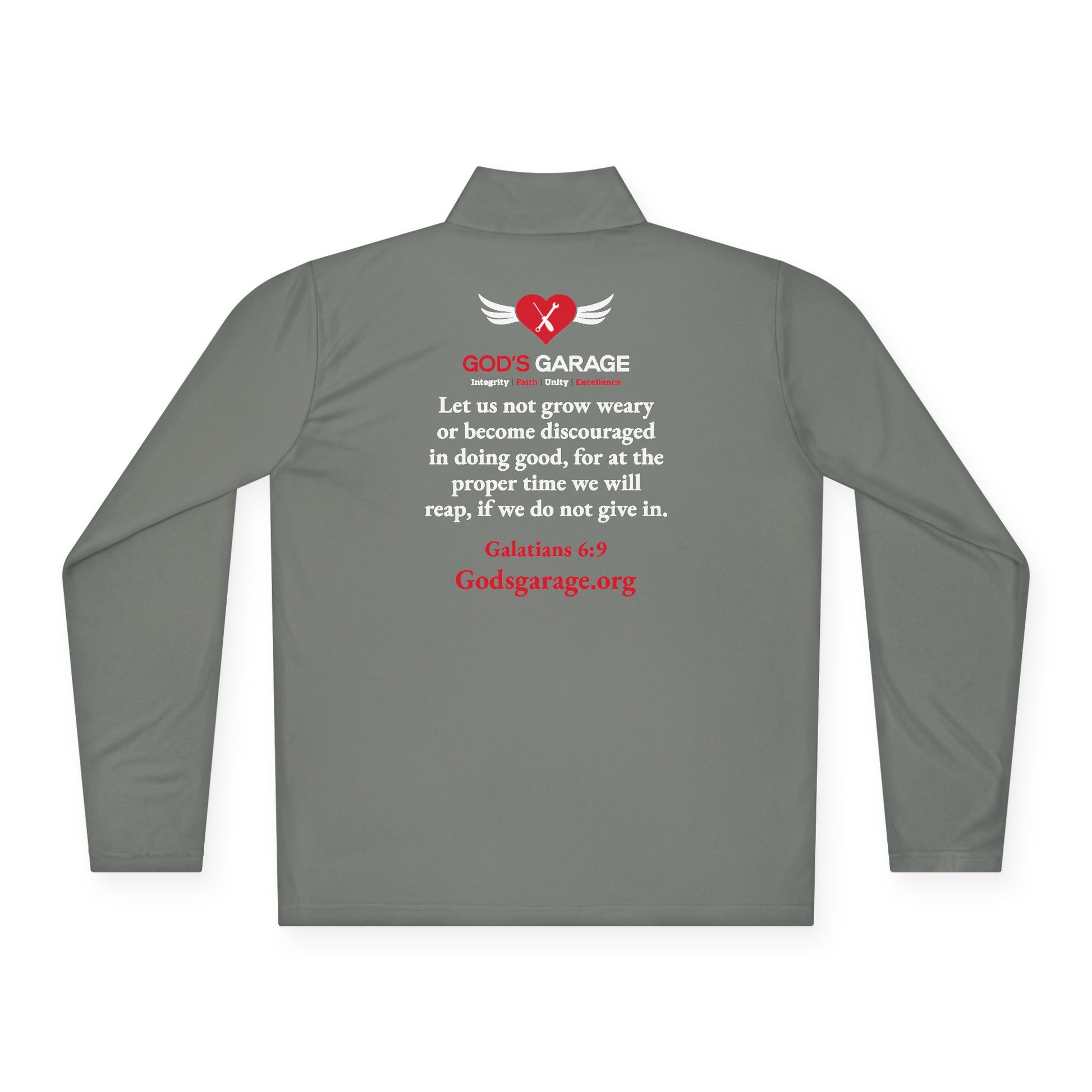 Stay active, comfortable, and inspired with the God’s Garage Performance 1/4-Zip Pullover, featuring Galatians 6:9 on the back as a reminder to stay steadfast in faith: